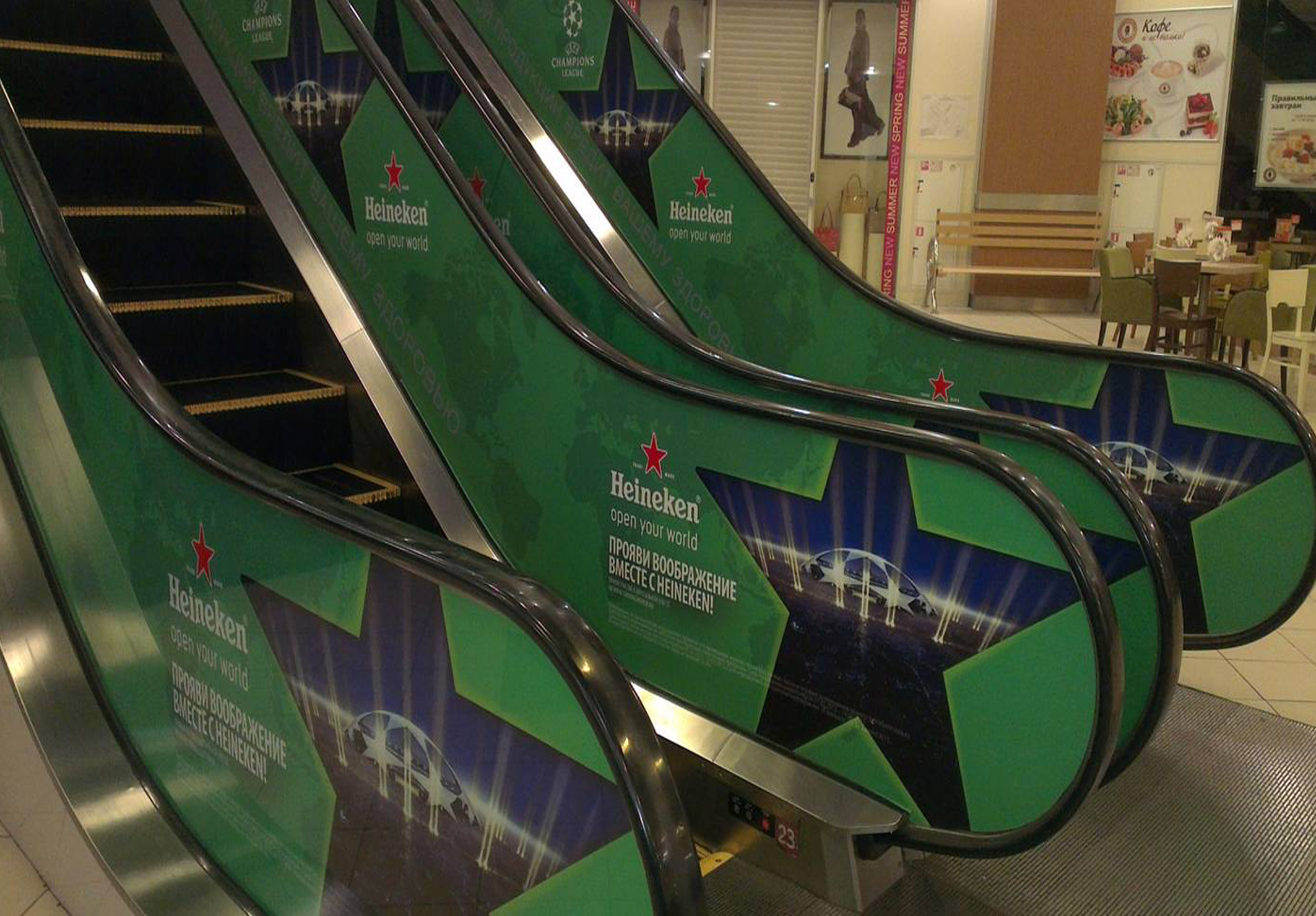 Пример рекламы в виде брендирования эскалатора в торговых центрах: